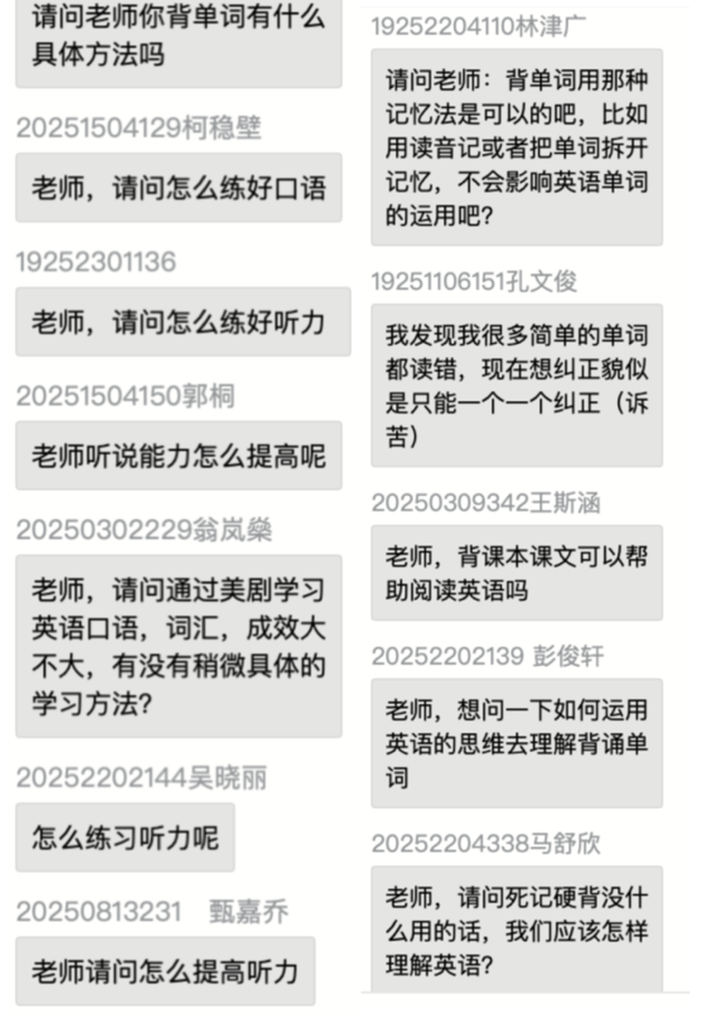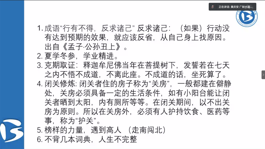 在互动环节中,各位同学踊跃发言,黄院长也进行了耐心的解答。黄院长精辟地指出,学生在面对翻译等难题时要站在不同的角度去理解,而在发音问题上,黄院长提出要利用身边的工具如手机电脑等来纠正自身的发音。另外,黄院长也提出以背字典为核心的背书计划来提高同学们在假期学习英语的效率,希望同学们在“克期取证,反求诸己”中获得英语学习带来的幸福感。