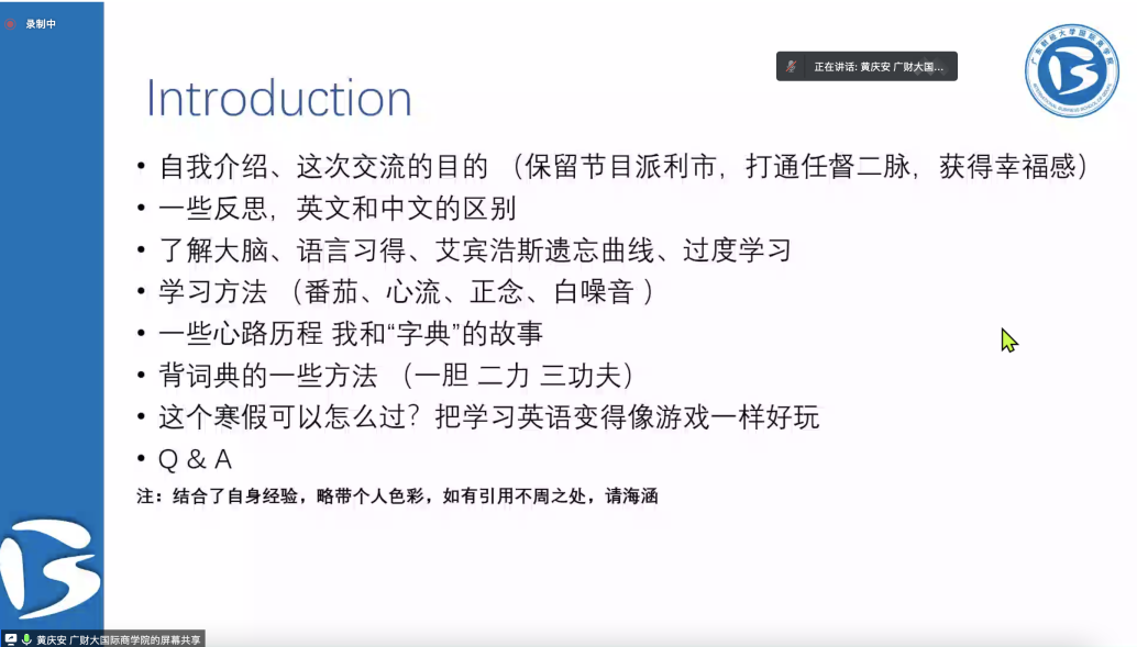 为帮助同学们高效利用假期时间提高自身英语水平,2月1日下午黄庆安院长举办了题为“如何利用假期学习英语获得幸福感”的讲座。此次讲座由黄晓乔老师主持、全校200余名学生参加。