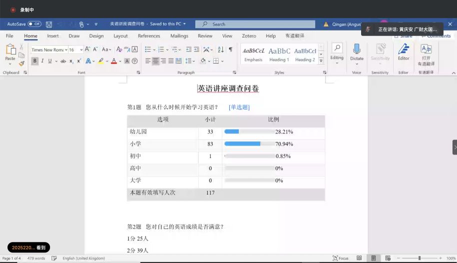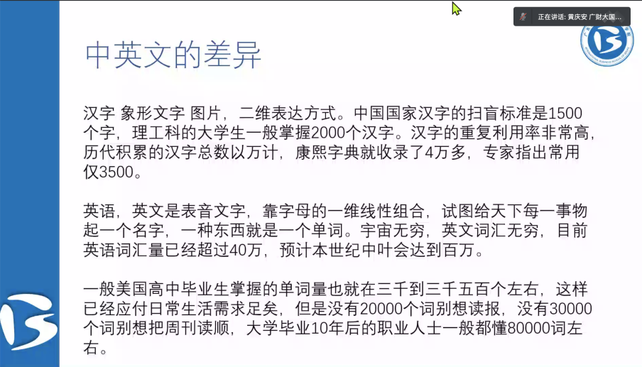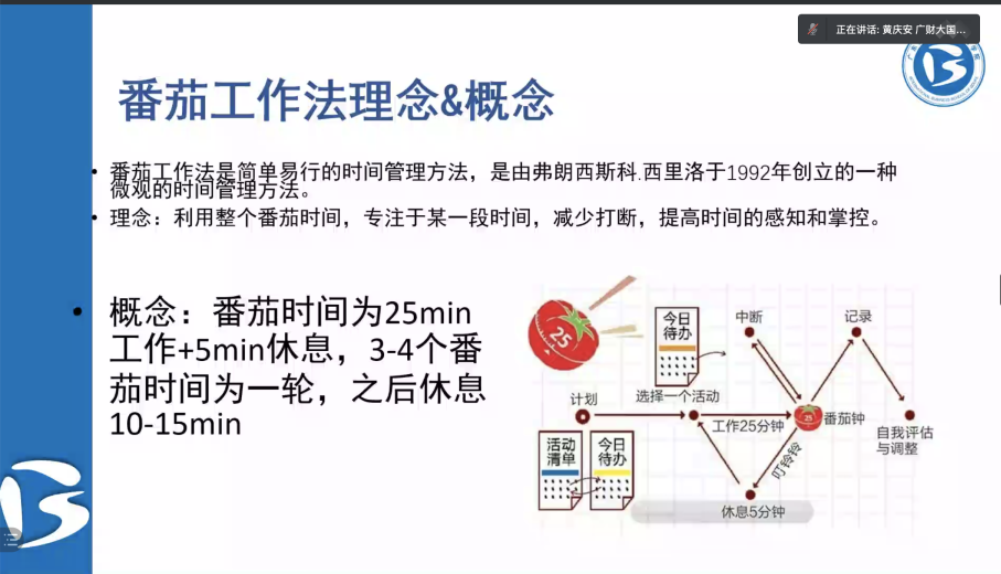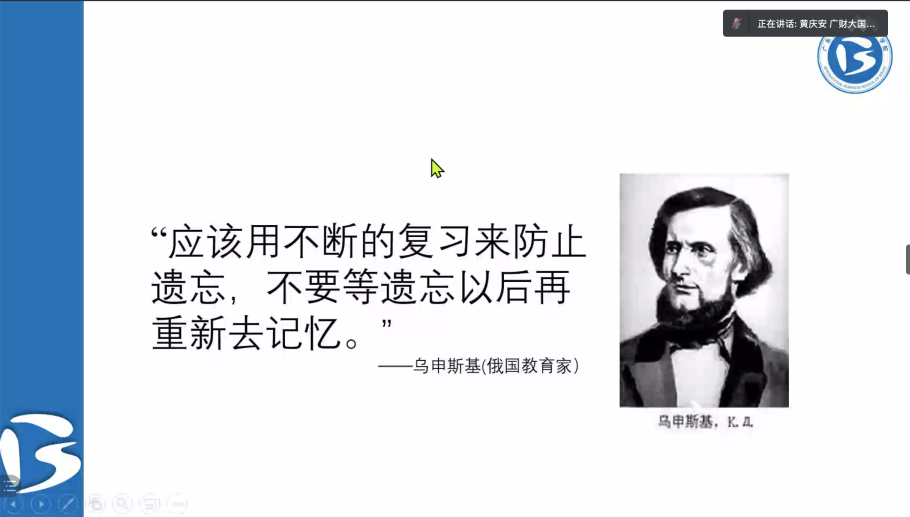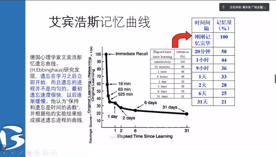 讲座伊始,黄院长对这次讲座内容进行了简单介绍,通过几个短片引出了对英语学习的看法,让同学们对自身的学习现状进行剖析。接着,黄院长就如何提高自身在学习过程中的效率给同学们介绍了几种有效的方法,黄院长指出,我们在学习英语时可以结合艾宾浩斯的遗忘曲线、番茄工作法、过度学习法等多种学习方法来提高学习效率。