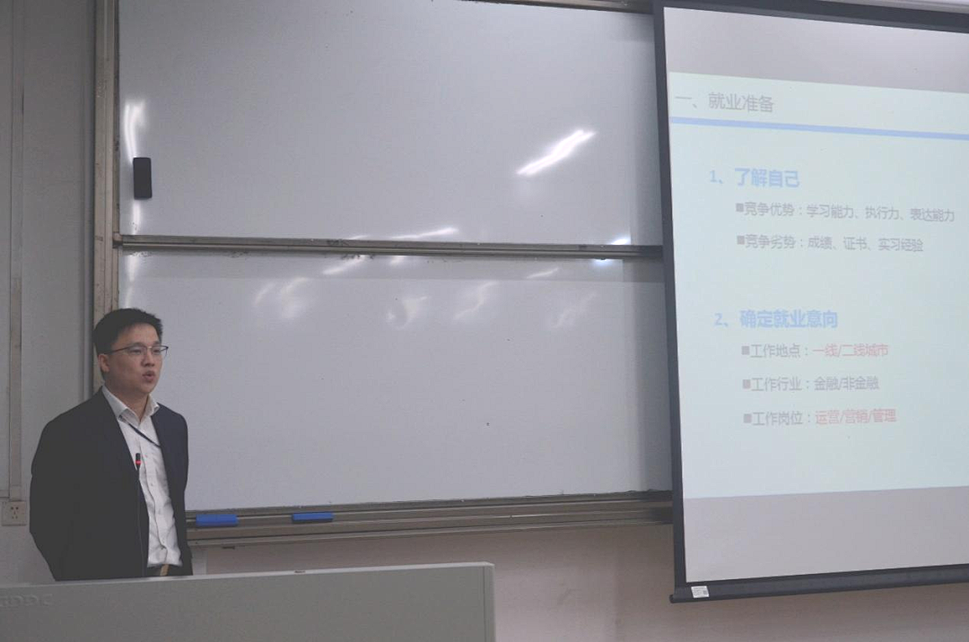 校友马学松在会上分享了自身多年来的校园招聘经验,向同学们介绍了就业准备、简历填写、面试考察等方面的内容,强调就业准备要先了解自己、确定就业意向、积极寻找工作机会,他着重向同学们介绍了简历填写注意事项和重点,通过现场为同学们展示、分析了各类求职简历的优缺点,提醒同学们注意借鉴和参考,并向同学们介绍了面试考察的主要类型以及应对技巧。最后,马学松寄语同学们“所有的成功都不是心想事成,而是奋力拼搏后的水到渠成”,并祝福同学们求职顺利。