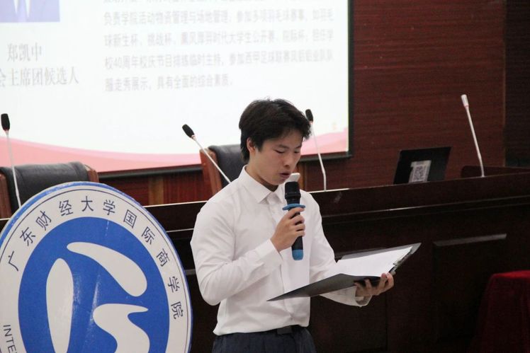 在主席团选举环节,郑凯中、郭芷欣、练珈羽、崔博岩四位候选人依次发表竞选演讲。