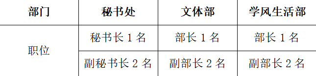 3、学风生活部:设3位部门负责人:1名部长、2名副部长。计划招聘干事不超过6人。