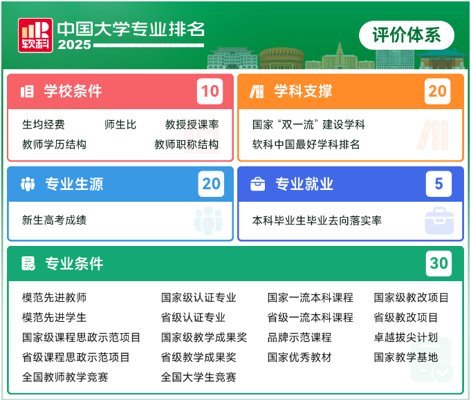 据悉,“软科中国大学专业排名”的评价体系由学校条件、学科支撑、专业生源、专业就业、专业条件5个指标类别组成,下设27项测量指标。在绝大多数专业,5个指标类别的权重分别为学校条件(10分)、学科支撑(20分)、专业生源(20分)、专业就业(5分)、专业条件(30分)。