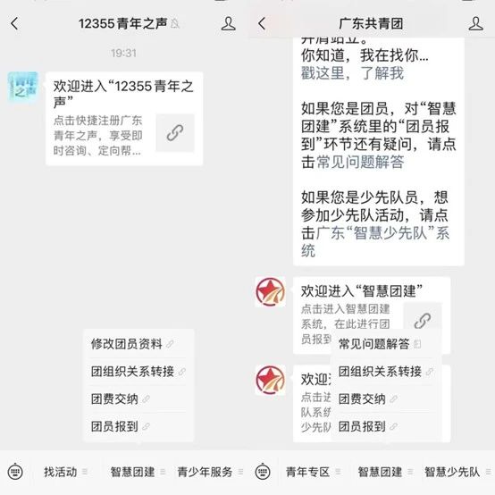 关注“广东共青团”或“12355青年之声”微信公众号,在公众号菜单栏点击“智慧团建”-“团员报到”。