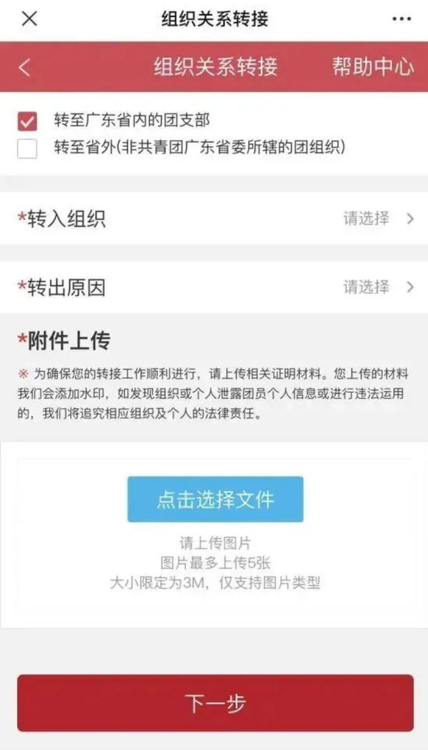 选择“组织关系转接”,准确输入团支部简称(建议使用所在团支部组织ID进行搜索)、准确填写转出原因、上传附件等,点击提交。