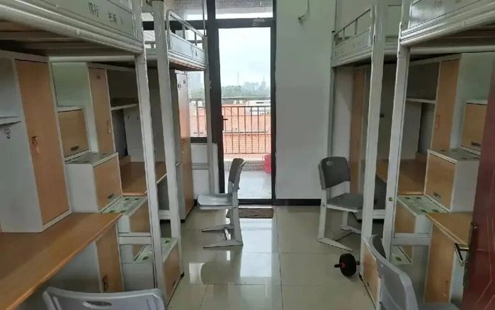 宿舍是四人间,有独立阳台,独立卫浴,上床下桌,洗衣机会在开学前统一订购,也可以和舍友商量自己买,每层有两个公共饮水机。床上有架子,没有挂钩。每个床位配备三个插座,上一个下两个。床铺尺寸:190×90x110cm。储物空间:每人配备单衣柜+床底抽屉+书架。床和桌子都是铁制。