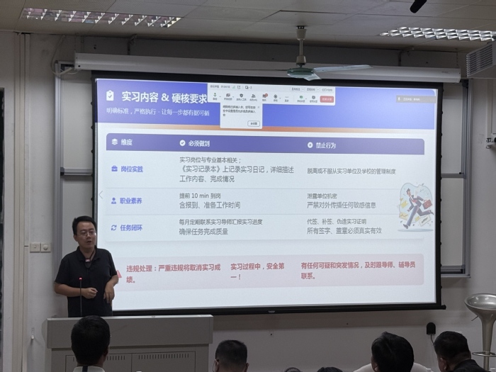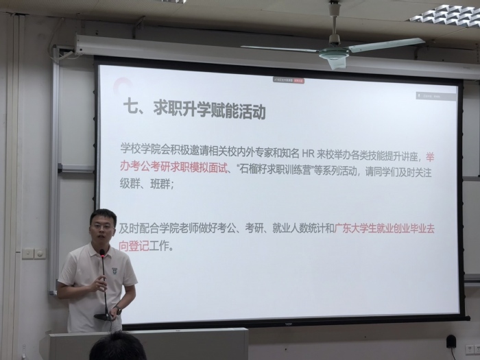 郭显军详细分析了学院近三年的毕业生就业数据,针对不同的毕业去向提出针对性建议:考研同学应制定“冲--保”三档目标,充分利用学院考研宿舍、真题库和校友导师资源;针对就业,他提醒同学们把握秋招黄金期,完善简历与面试技巧,将个人规划与国家需求、区域发展紧密结合,实现高质量升学与就业。罗任飞介绍了毕业实习的有关事项,帮助同学们进一步明晰毕业实习要求。熊敏讲解了毕业审核、学分修读、实习安排等事项并针对同学们提出的教务问题进行了详细解答。陈迪通过数据图表展示了学院26届毕业生“第二课堂成绩单”学分修读进度,分析了目前存在的问题,并提出针对性建议。刘宏韬详细介绍了学院针对26届毕业生组织的就业考公考研系列帮扶活动,并提醒大家关注生源信息上报等近期就业工作中的重要事项。